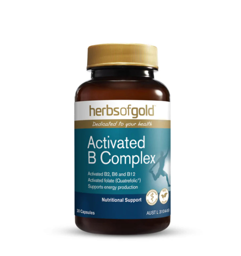 Herbs of Gold Activated B Complex contains activated B vitamins, including B2, B6, methylfolate (folate) and mecobalamin (B12), to help support energy production and assist in the maintenance of general wellbeing