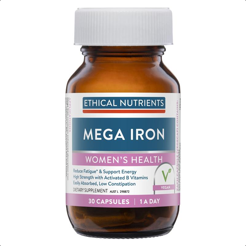 Ethical Nutrients Mega Iron with Activated B Vitamins, a vegan friendly, high strength, easily absorbed and low constipation formula to help maintain healthy iron levels.