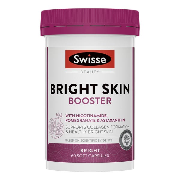 Swisse Beauty Bright Skin Booster is a unique beauty nutrition formula, with targeted skin nutrients to support collagen formation, skin elasticity and firmness.