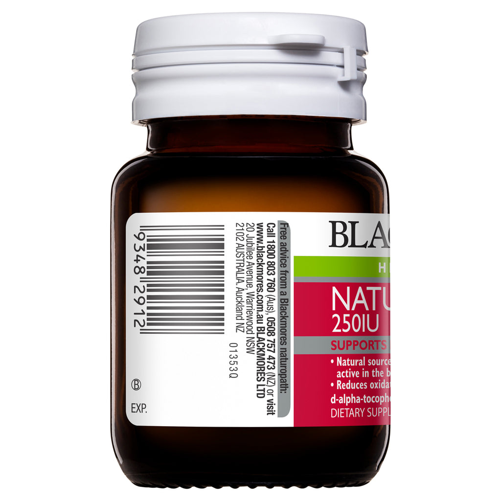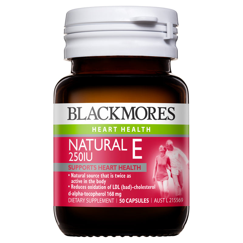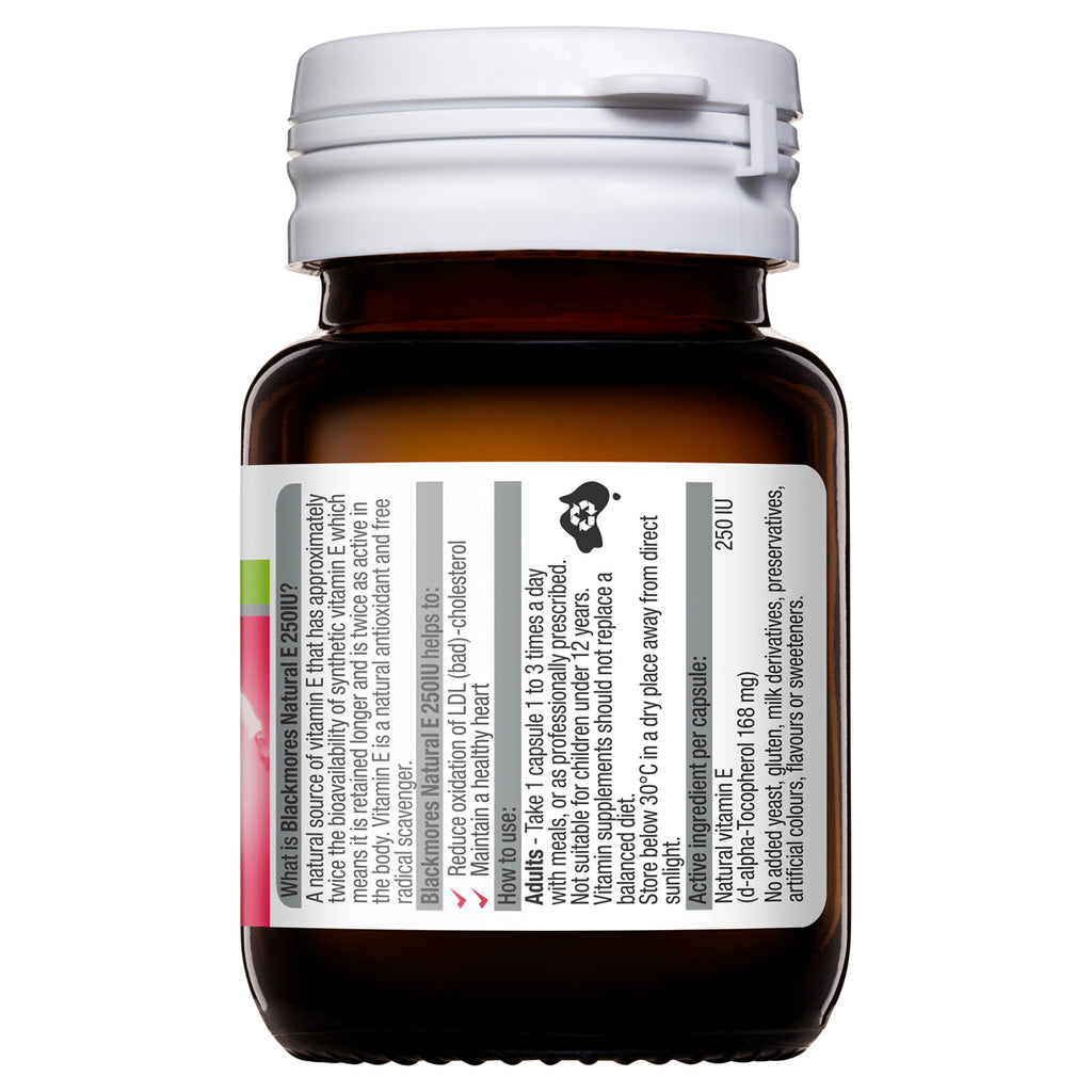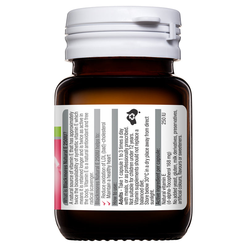 Blackmores Natural E 250 IU contains vitamin E which is an antioxidant and free radical scavenger that helps protect cells from free radical damage. Vitamin E also supports heart health. Blackmores Natural E 250 is also a source of natural vitamin E which is more available (easily absorbed) and is retained longer in the body, than synthetic vitamin E.