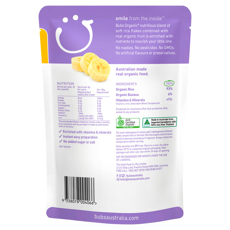 Bubs Organic Baby Banana Rice Cereal 4 Months+ 125g