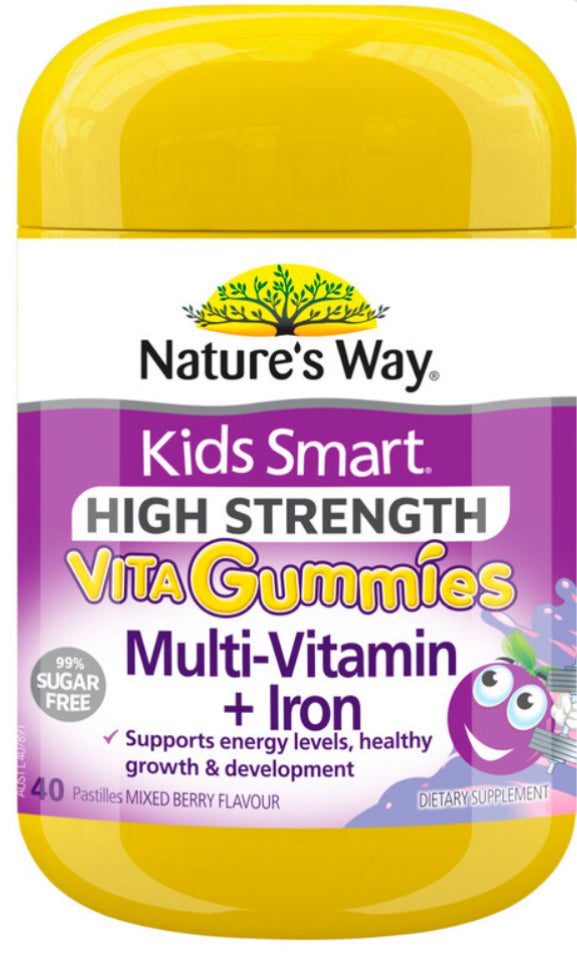 Nature's Way Kids Smart High Strength Vita Gummies Multi-Vitamin + Iron has 10 key vitamins & minerals + 2.5mg Iron to help support healthy growth and development, immune system health and energy production when dietary intake is inadequate.