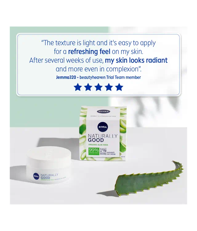 NIVEA Naturally Good Radiance Day Cream formula with Organic Aloe Vera works to moisturise your skin for 24 hours, leaving you healthy looking and fresh feeling. Made of 99% ingredients of natural origin* and offers 100% transparency on all the ingredients contained. We use ingredients inspired by nature to create high performance products that bring out the natural beauty of your skin. The skin compatibility of the moisturiser has been dermatologically approved. *ingredients sourced from nature retaining greater than 50% of their molecular structure (natural state) after being processed, including water.