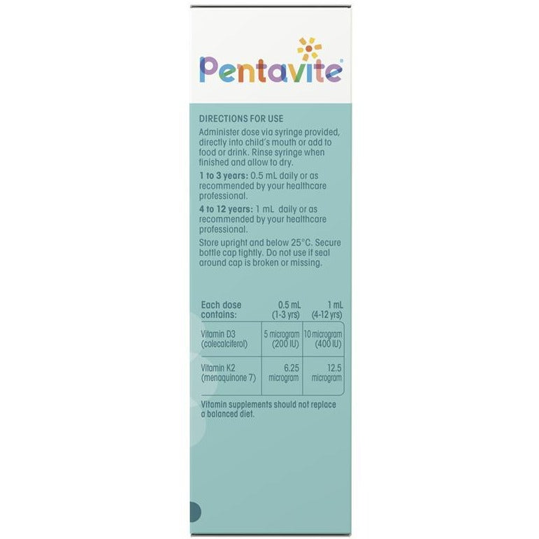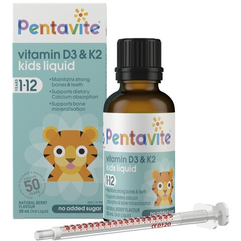 Vitamin D3 helps the body absorb dietary calcium while Vitamins D3 and K2 help support bone mineralisation. Pentavite® Vitamin D3 & K2 Kids Liquid is a great tasting formula that kids will love!