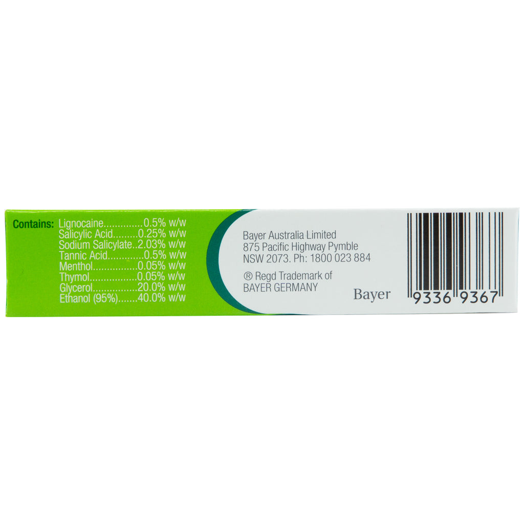 Contains- Lignocaine 0.5%w/w, salicylic acid 0.25%w/w, sodium salicylate 2.03%w/w, tannic acid 0.5%w/w, menthol 0.05% w/w, thymol 0.055w/w, glycerol 20%w/w, ethanol 40%w/w