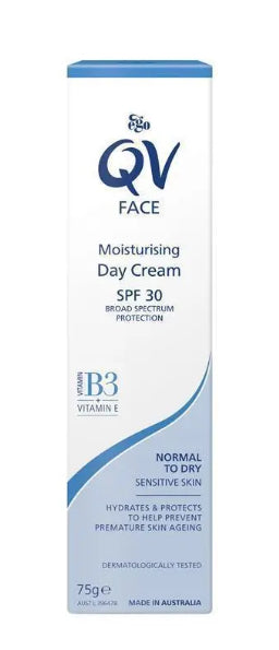 帮助保持干燥或敏感肌肤全天保湿,使用QV面部保湿日霜。温和配方专为面部和颈部的敏感肌肤设计,结合了保湿霜的功效和SPF 30防晒霜的保护,有助于防护皮肤癌、皮肤过早老化及皱纹形成。