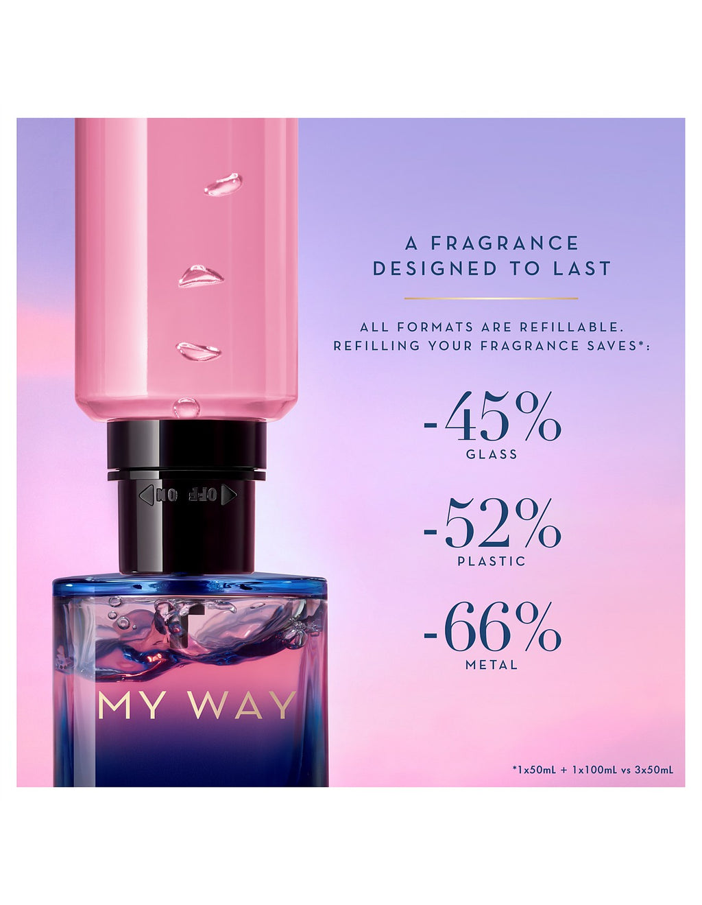 阿玛尼美妆的My Way香水配备创新的补充系统,通过采购负责任和可持续的成分以及通过森林保护项目保护生物多样性,减少其碳足迹和环境影响。